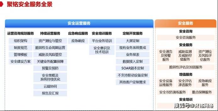 在产品之外,聚铭网络深刻洞察当前网络安全“重产品、轻服务”的结构性短板,率先打造专业化“安全管家服务”品牌。公司核心安服团队拥有近20年实战经验,累计实施上百次大型安全项目,服务范围涵盖运营管理、侦听测绘、安全测试、红蓝对抗、应急响应、人才培养等六大类场景。